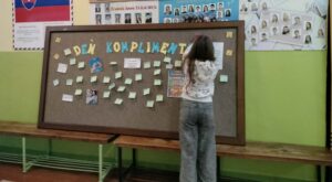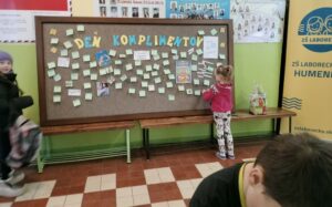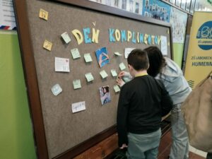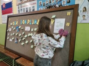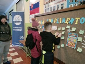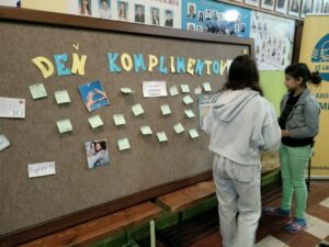 Dnes sa na našej škole niesla atmosféra plná milých slov a pozitívnej energie. Uskutočnil sa Deň komplimentov, počas ktorého mali žiaci možnosť napísať pár láskavých slov vo vestibule školy a pripnúť ich na nástenku. Jednoduchým gestom tak mohli potešiť spolužiakov, učiteľov či kohokoľvek, komu chceli vyčariť úsmev na tvári.